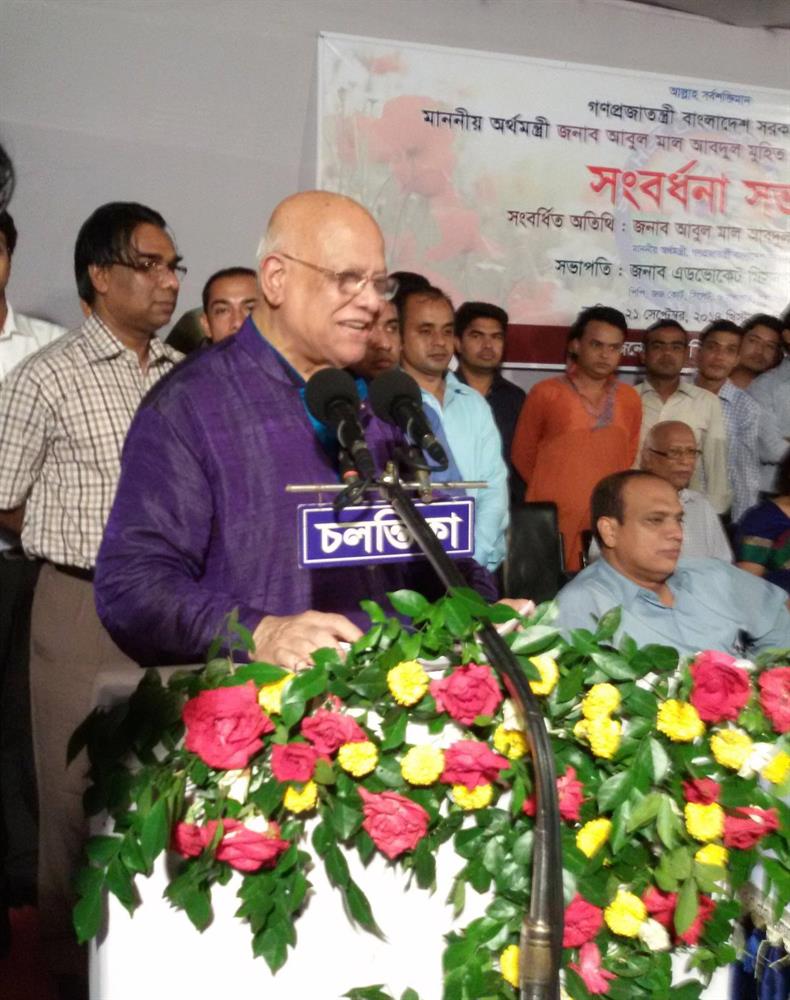 Hon'ble Finance Minister Mr. Abul Mal Abdul Mohit M.P. is delivering the chief guest speech at the Felicitation ceremony.